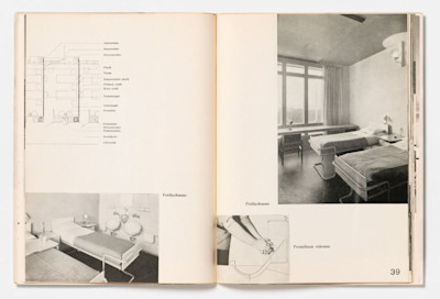 Aalto designed this Sanatorium for tuberculosis patients to be a “medical instrument,” a structure actively engaged in the healing process. For instance, particular attention was paid to the design of the patient bedrooms: these generally held two patients, each with his or her own cupboard and washbasin. Aalto designed special non-splash basins, so that the patient would not disturb the other while washing. Each patient had their own specially designed cupboard, fixed to the wall and off the floor so as to aid in cleaning beneath it. The patients spent many hours lying down, and thus Aalto placed the lamps in the room out of the patients line of vision and painted the ceiling a relaxing dark green so as to avoid glare.