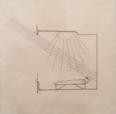 Aalto designed this Sanatorium for tuberculosis patients to be a “medical instrument,” a structure actively engaged in the healing process. For instance, particular attention was paid to the design of the patient bedrooms: these generally held two patients, each with his or her own cupboard and washbasin. Aalto designed special non-splash basins, so that the patient would not disturb the other while washing. Each patient had their own specially designed cupboard, fixed to the wall and off the floor so as to aid in cleaning beneath it. The patients spent many hours lying down, and thus Aalto placed the lamps in the room out of the patients line of vision and painted the ceiling a relaxing dark green so as to avoid glare.