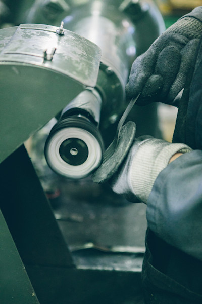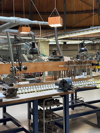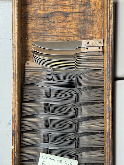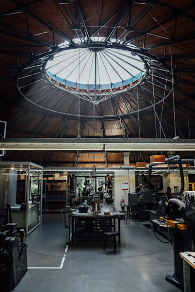David Mellor’s son, Corin, is an acclaimed Designer in his own right. In the summer of 2022, I accepted an invitation from Corin to visit, the Round Building, their beautiful factory in the small village of Hathersage in Derbyshire, UK. The surrounding countryside is a spectacularly stunning stretch of the Peak District National Park. Single lane roads wind through the pristine, pastoral landscape and in a moment of unexpected wonder give way to the David Mellor Round Building. The celebrated building was erected in the early 1990’s and designed in partnership between David Mellor and architect Michael Hopkins. Built upon the circular foundations of a former Victorian gas tank, it sits like a chapel, nestled in woodland. Although no chapel of dogma, the building certainly is an architecture of reverence and has become a pilgrimage site for the design connoisseur. Natural light dapples workbenches and machinery through a central round skylight in the conical roof. Sheet metal enters the building and moves counterclockwise via a series of machines and workstations. The material exits out the same door as transformed flawless, iconic hand-crafted cutlery. Intriguingly, those working at each station are skilled and experienced in every step of production and rotate their positions routinely – great pride is taken when polishing the knife at one station that they may have stamped at a previous station days prior. There is a tranquility to the space. The machinery appears to have been collected over the decades. The interior is sparse, timeless in its utility and beautiful in its simplicity. A simple palette of concrete, steel and plywood render the interior with an austere sophistication something akin to Donald Judd’s Marfa buildings.