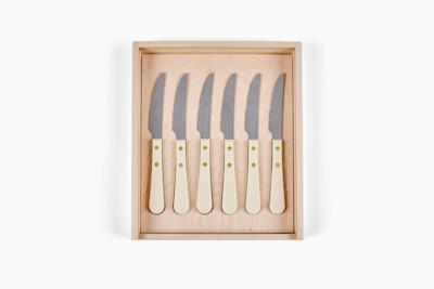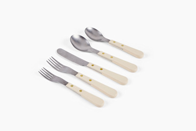 As a British Designer based in California, I'm delighted to introduce Commune’s collaboration with British design icon David Mellor; a new interpretation of his classic Provençal flatware. When first developed, the line was technically revolutionary in combining stainless steel with high quality acetal resin during a time of culinary revolution towards healthy eating. With its gently rounded handles and soft curved lines, it remains a staple in modern homes and restaurants reflecting increasingly relaxed attitudes towards the presentation of fine food. The exclusive Commune edition features tumbled, high-carbon stainless steel paired with ivory colored resin handles secured with brass rivets.