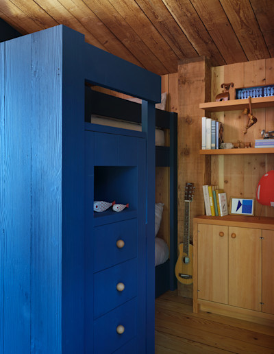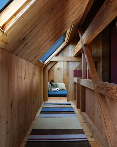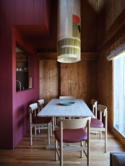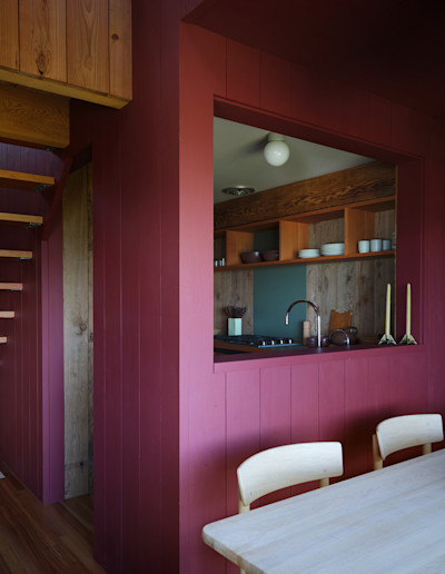 The colors themselves were drawn from Lawrence Halprin’s original Sea Ranch landscape plans, embedding the palette directly into the project’s DNA. Our sampling process was exhaustive, testing paint on rough-sawn and smooth boards, varied grain patterns, and different sides of the same piece of wood. What emerged was striking. The wood transformed the paint. Color never simply sat on the surface; it was absorbed, softened, and altered by the material beneath. The boards became both canvas and collaborator. This remained a wood interior through and through, paint and all.