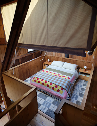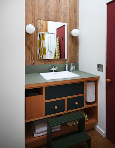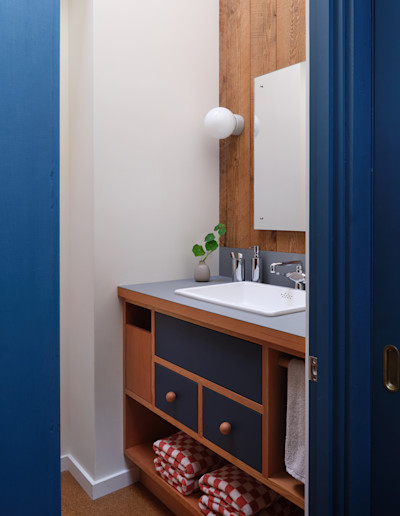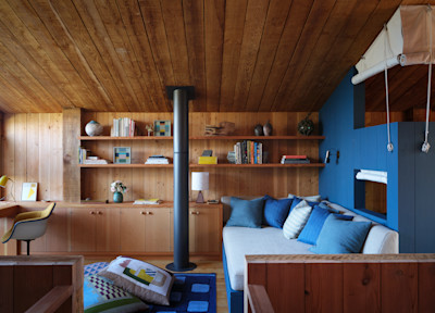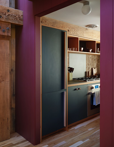 Determining where paint should begin and end felt perilous. Our team compared the process to pulling a loose thread on a sweater. The guiding principle was to restore clarity to internal forms that had been visually lost within the redwood’s relentless presence. Turnbull’s writings reveal his intent to preserve barn-like interiors without subdividing spaces, using towers he likened to “super-scaled furniture” to define zones. He described the sleeping loft as “a four-poster bed, itself a story high, and sheltering underneath its legs a dark cozy fireplace area,” and the kitchen and bath as “a two-story cabinet… a functional bureau.” He reserved smoother, milled boards for these furniture towers to distinguish them from the rougher architecture. Moore found this distinction too subtle in his own unit, experimenting with paint and color blocking to further articulate the forms. We followed his lead.