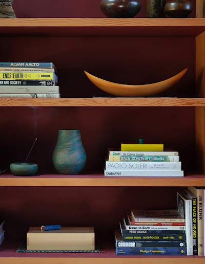 Charles Moore’s unit offered an unexpected kind of permission to play. Moore was both a founding member of MLTW and a longtime Sea Ranch resident, and his condominium reveals decades of experimentation layered atop the original framework. His MLTW partner Donlyn Lyndon remarked, “Charles was continuously reimagining the unit: adding objects and furniture that took his ever-active fancy, painting and repainting its ‘finished’ surfaces, and filling it with his wit and companionship.” His work makes a persuasive argument that wood, while essential, is not sacred. When redwood covers every surface, it can obscure the legibility of form and compete with the very architectural moves it is meant to articulate.