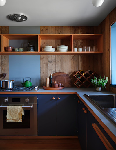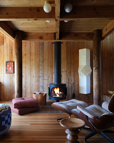 The range of grain patterns, patinas, and saw textures in the existing interiors shaped our material palette and pushed us to be inventive in how we treated each board. Redwood was never a single finish, but a spectrum of textures and tones. We selectively introduced old-growth redwood reclaimed from barns near Yosemite, the baroque grain patterns of the logs adding visual interest and depth. Elsewhere, where uniformity and utility were paramount, such as the kitchen millwork, Douglas fir offered a quieter counterpoint. The smallest details became opportunities for specificity: the spherical cabinet door pulls throughout the project were turned on a lathe, with the wood carefully oriented to create concentric circle patterns that celebrate the grain. With these details, the renovation elevated the project by elaborating on the possibilities already present in the wood.