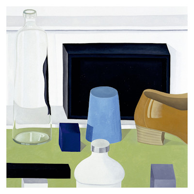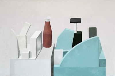 Du Pasquier’s paintings certainly are born from the radical tendencies of the Group, but offer something perhaps more nuanced. In each painting is a keen grasp of color theory and spatial awareness. She begins by arranging her own 3D sculptures as still lives, and moves to translate these sculptures onto a 2D canvas. What results is not a photographic representation of reality but rather a singular iteration, brought to life and exaggerated by her uniquely abstract composition. During this process of ideation, composition and observation of space, there are losses and gains in how visual information is represented. A plane might bend, and a curved object might become flat. But it's in this movement between media that the sweetness of Du Pasquier’s paintings emerges.